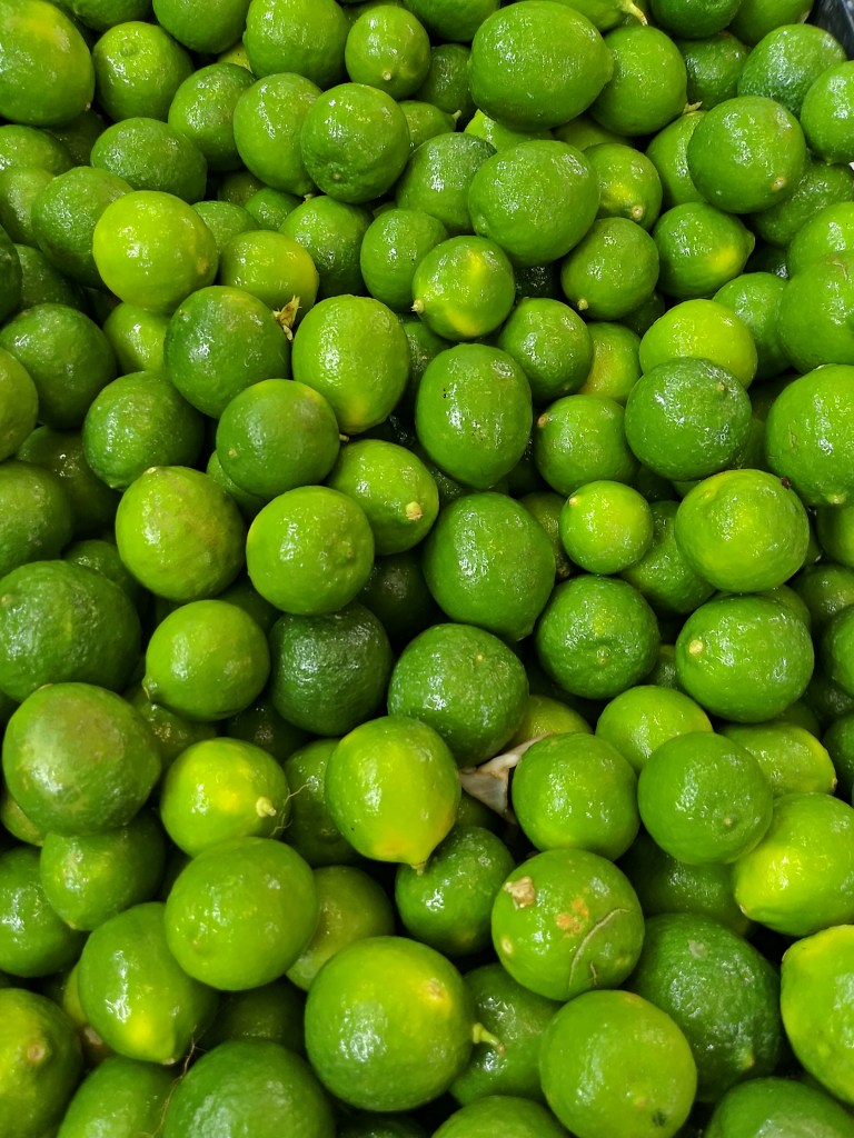 These little limes, similar to Key Limes, are sweet and inexpensive. (REALLY inexpensive!) One learns to use them instead of lemons in everything. But I will admit that there’s nothing like the taste of a real yellow lemon – a little exotic here – and I do buy them once in awhile.