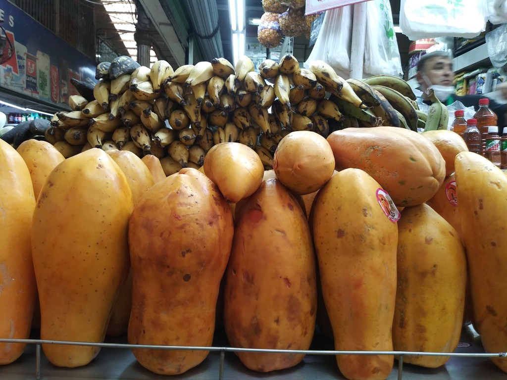 I’d intended to just get a few things (limes to make a pie and limeade, bananas, a few potatoes) and instead went home with two overflowing bags that included a fragrant sweet pineapple and one of those papayas in the photo below.