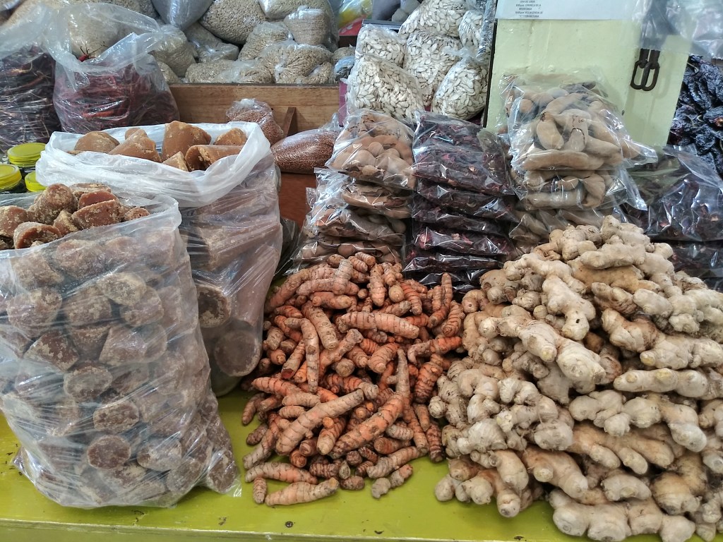 Fresh ginger and turmeric, piloncillo, and tamarind pods.