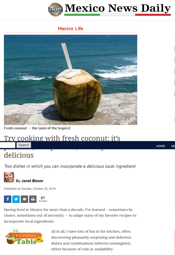 My newest project is writing a twice-monthly cooking column for Mexico News Daily. It’s called The Tropical Table, and features info and recipes using local ingredients. The first column is about fresh coconut.