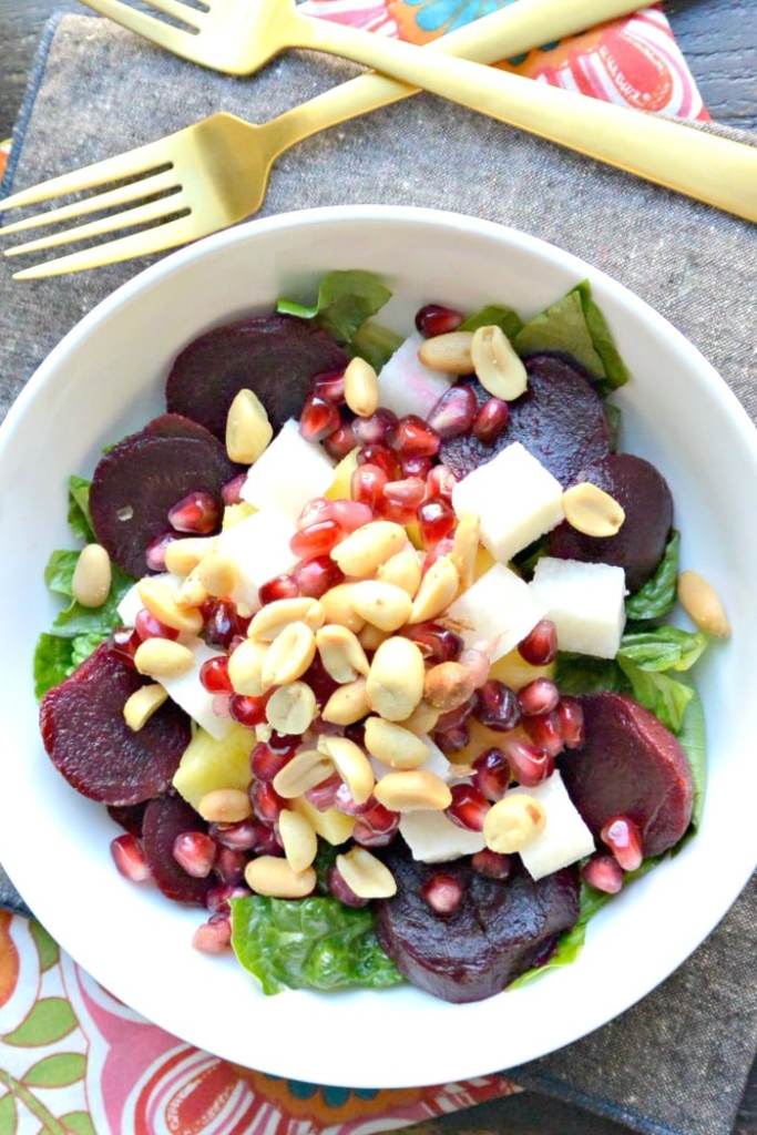Ensalada Navideรฑa or Ensalada Nochebuena is a traditional Mexican Christmas salad made with seasonal fruits. While there are some standard ingredients โ orange or mandarin sections, jicama, beets, lettuce, apples, pomegranates, peanuts โ each region of the country has a different recipe depending on whatโs available. Pineapple, pecans, guavas, fresh coconut โ pretty much anything goes! The result is a vibrant, colorful and delicious salad.
