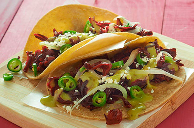 Most of you have probably had agua fresca de jamaica – the refreshing, ruby-red iced beverage that’s served everywhere in Mexico. Chances are a good many of you make it at home, too, as it’s easy, inexpensive and a welcome drink on a hot day. What you may not know is that the soaked flowers can also be used as a delicious and beautiful taco filling.